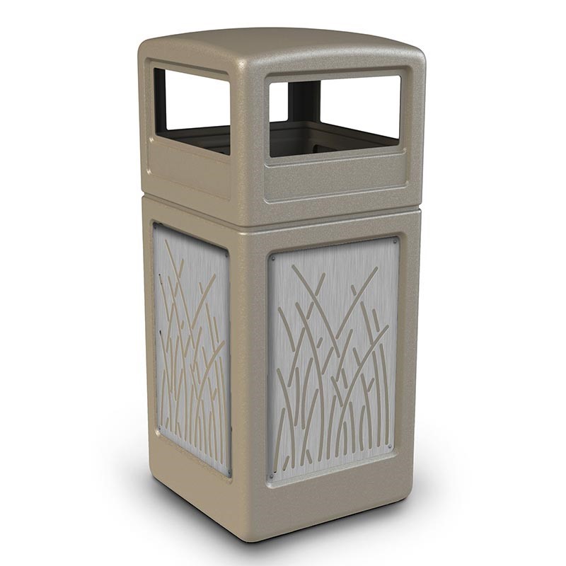 Our 42-gallon dome top plastic trash receptacle with decorative reeds stainless steel panels is a beautiful addition to parks, restaurants, and gardens, both inside and outdoor. This unit is molded from durable high-density polyethylene and includes attractive stainless steel panels with punched-out reeds pattern affixed to each side. The 4-way entrance dome top makes trash disposal easy in high traffic areas, while preventing most rain from entering the trash can. Featuring a lock design to secure the lid to the base and grab bag system that holds the waste bag out of view. Multiple color options available for you to choose a look that's right for your location! Made in the USA and is supported by our 1-year commercial warranty.