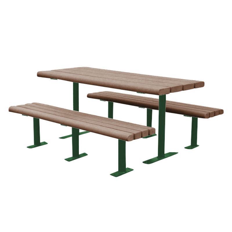Our Park Scapes recycled plastic picnic table with steel frame is a perfect addition to parks, schools, and gardens. Crafted with heavy-duty bull nose recycled plastic slats, 3" x 8" for the top and 3" x 4" for the detached seats. Recycled plastic is an attractive alternative to natural wood as it does not require much maintenance for its many years of dependable service. Made of strong powder-coated steel, the durable frame will resist rust, rot, and fade in all weather conditions. Choose the color for the tabletop & seats and the frame to compliment your surrounding outdoor area. Select between the secure surface mount or the more permanent inground mount. This product is made in the USA and is supported by our 5-year commercial warranty.