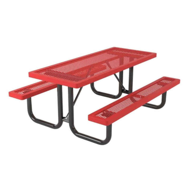 Our Regal Style Polyethylene Coated Metal Picnic Table is the perfect seating solution for parks, schools, and outdoor restaurants nationwide. The elegant regal style is designed with a durable 3/4" #9 expanded metal top and a heavy-duty commercial grade powder-coated galvanized steel frame. For extra support two 2" x 2" angle iron frame bracings are used on the frame. This frame also uses a portable design and includes non-corrosive hardware. Pick between either a 6 or 8-foot length choice, and a variety of colors for the tabletop/seat and frame. The product comes with a 5-year commercial warranty and is made in the USA.