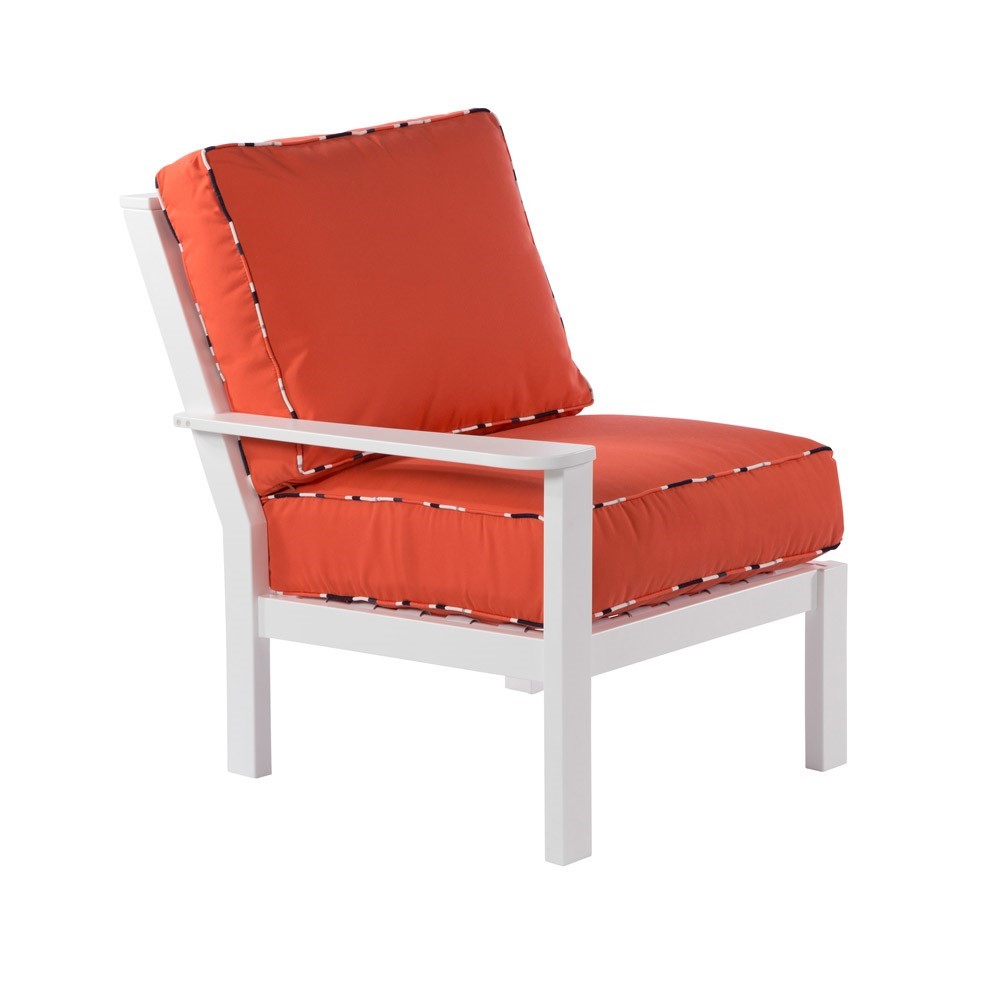 This lounge chair with an arm on the right side is one of many pieces that make up the hospitable Sanibel Modular Deep Cushion Seating Collection. Heavy-duty HDPE marine grade polymer makes up the frame and the back structure, while the seat is supported with vinyl strap. The cushions are made to resist mildew, stains, and fading, making it a perfect for both indoor and outdoor use. Mix and match the other components to utilize the space in your lobby or patio area. Sectional connectors are included with all sectional pieces. Furnish the conversational areas of your hotel, resort, and country club with this comfortable Sanibel Sectional Collection. Call us today for a great quantity discount to dress up your entire establishment.